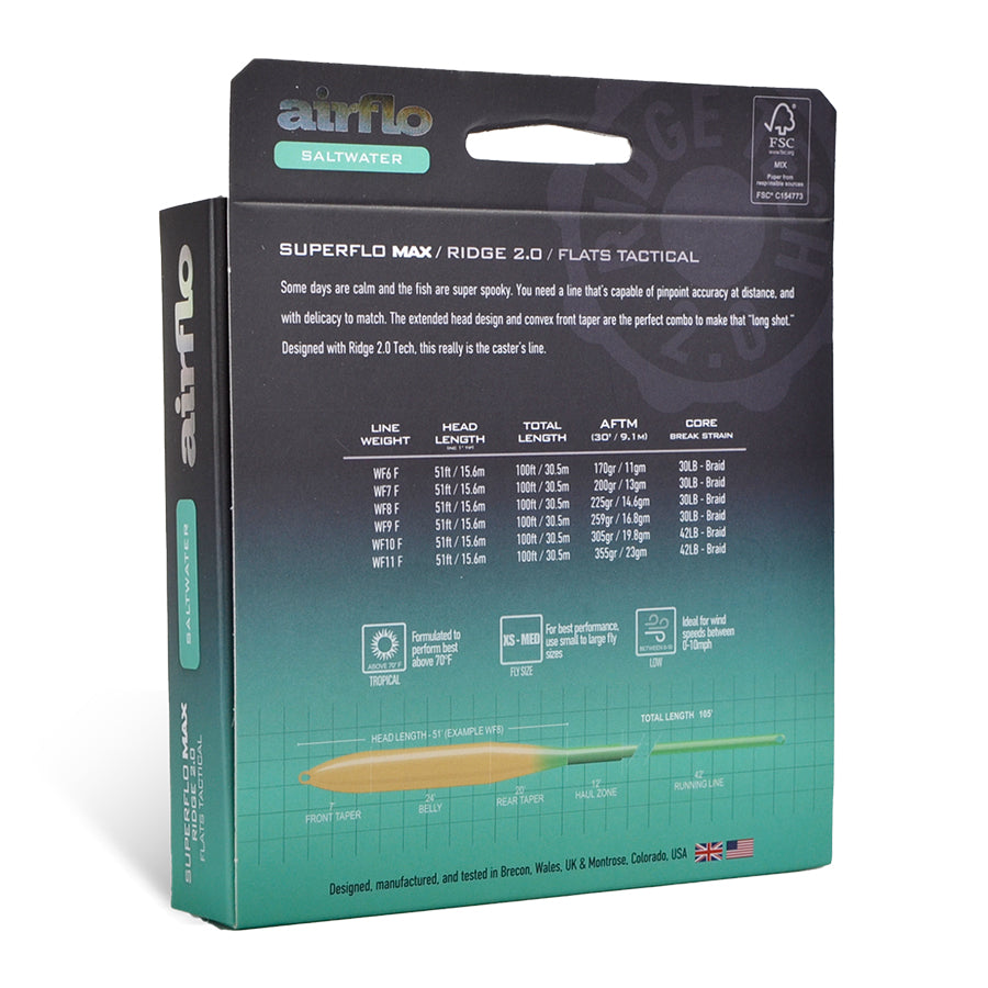 Some days are calm and the fish are super spooky. You need a line that's capable of pinpoint accuracy at distance, and with delicacy to match. The extended head design and convex front taper are the perfect combo to make that long shot. The Superflo Max Flats Tactical taper really is the caster's line. Now with Ridge 2.0 Tech, this line shoots and lands extremey delicately ensuring you don't spook your quarry.